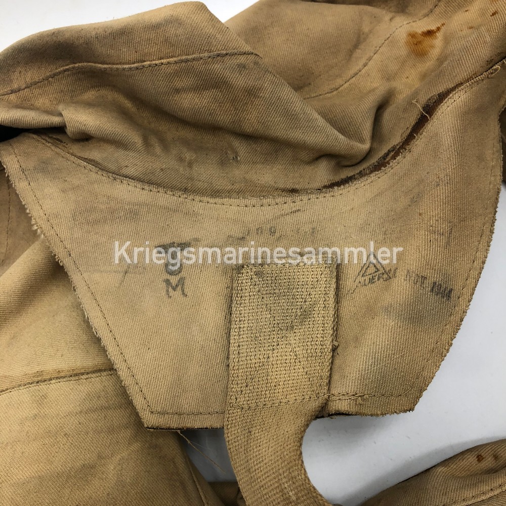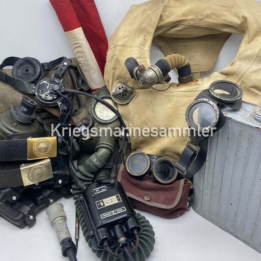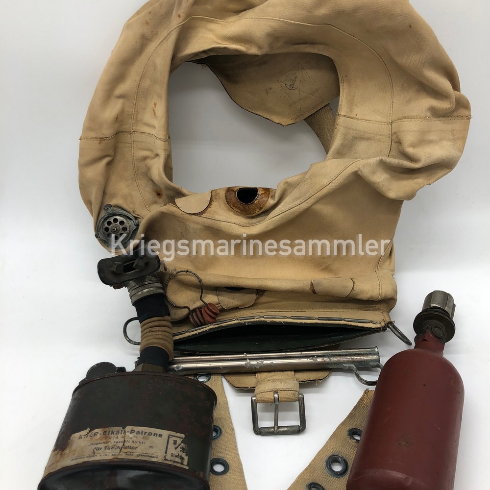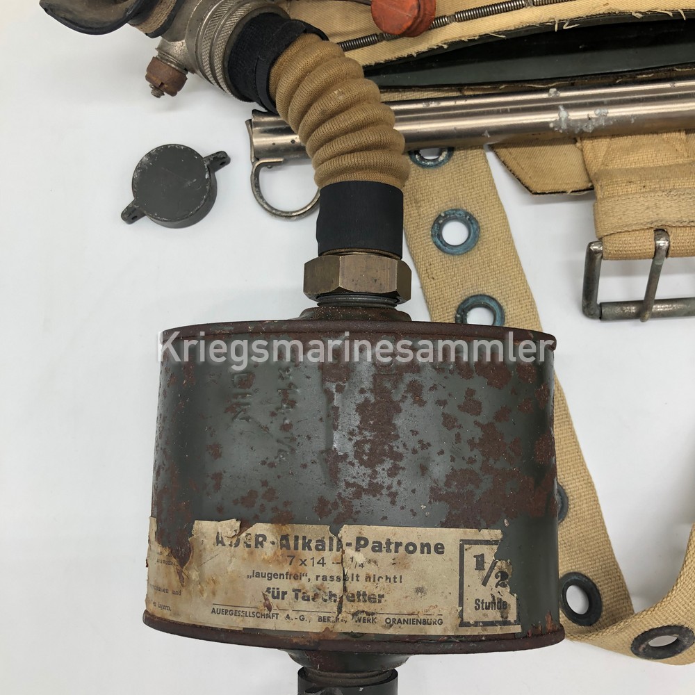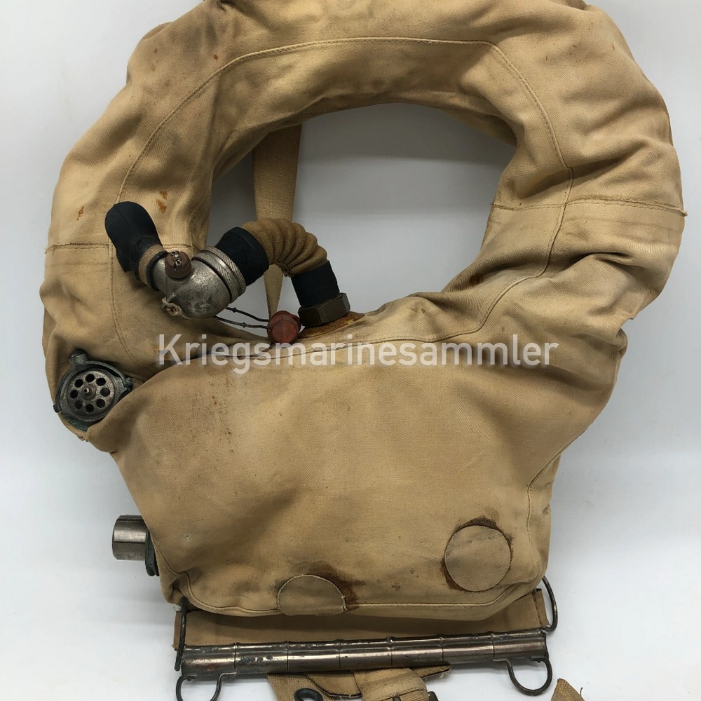 Here shown is a nicely marked Late war Nov 1944 Tauchretter made by Auer, less common then the Dräger made ones. This rescue device was equipped with a breathing bottle ”Alkali-Patrone” and with a Co2 flask to blow the vest. Each crewman was equiped with this Tauchretter and it was very important in a German U-Boot, for fresh air when toxic gasses were released or for escaping the U-Boot in emergency. For some reason this set was equiped with a Co2 bottle of a very rare Tauchgerät which was used with a special diving suit.