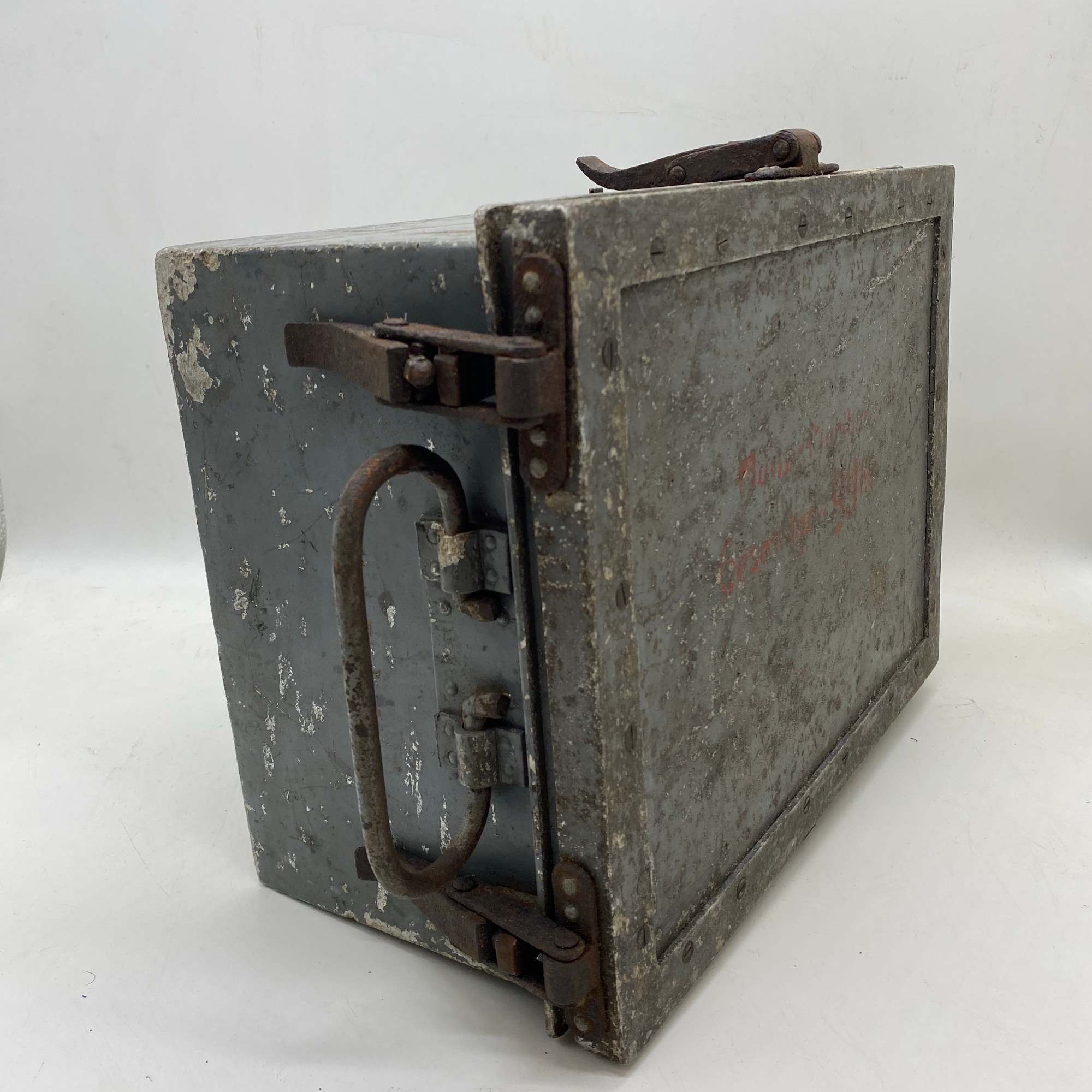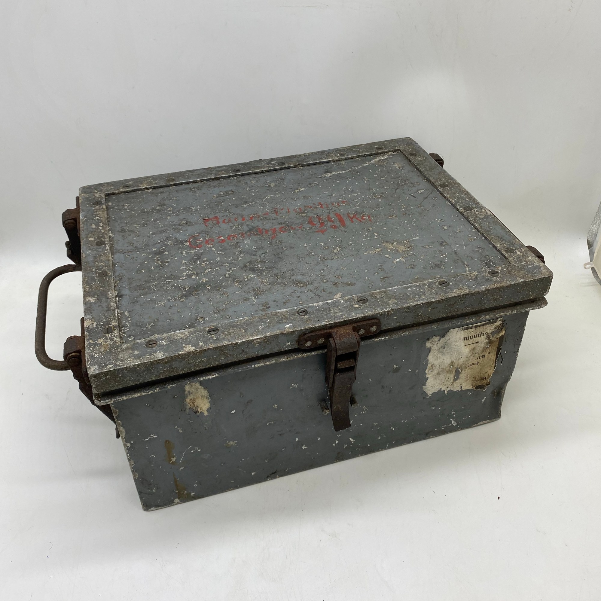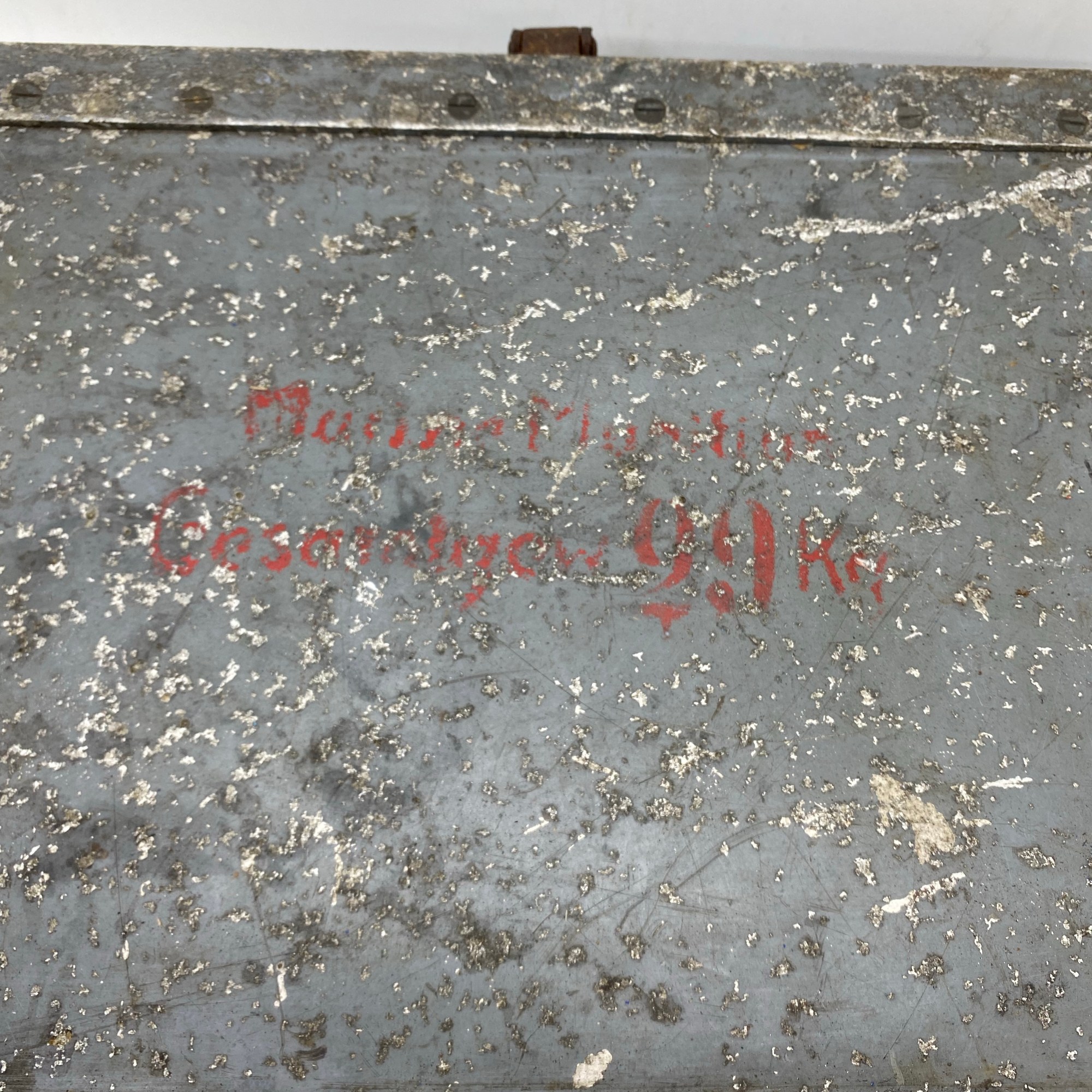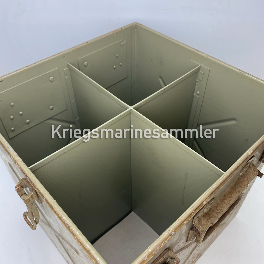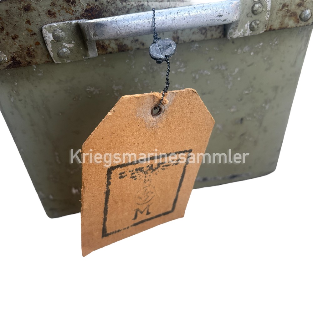 Kriegsmarine Marine Munition kiste. Nice lightweight box made from alluminium. On top it says Marine Munition (which indicates this is for the Kriegsmarine or maybe Küstenartillerie) Gesamtgewicht 29kg (Which indicated if filled that the Total weight would be 29kg). On the front are the remains of the label.