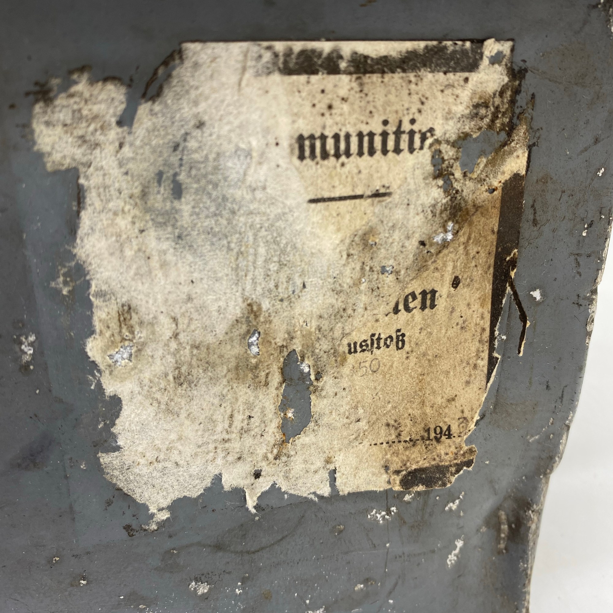 A very rare box for Kriegsmarine Rettungsbojenlichte. Its marked with a 3 letter code ‘dve’ and plate mentioning ‘Kasten für Rettungsbojenlichte’. This box was filled with 4 Rettungsbojenlichte, Red coloured lifebuoy lights. When thrown into water the chemical items inside would react and would make a visible smoke. Box remains with some slight rust on the outside, inside mint condition.