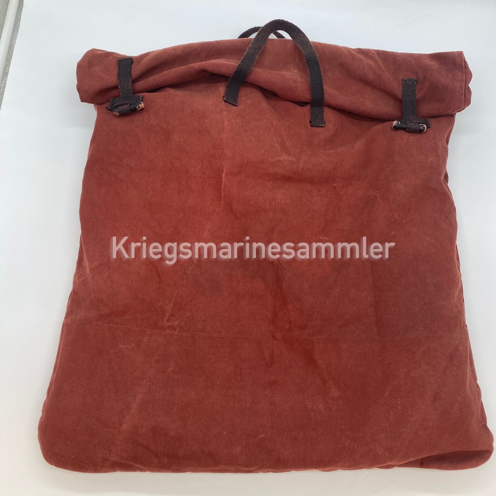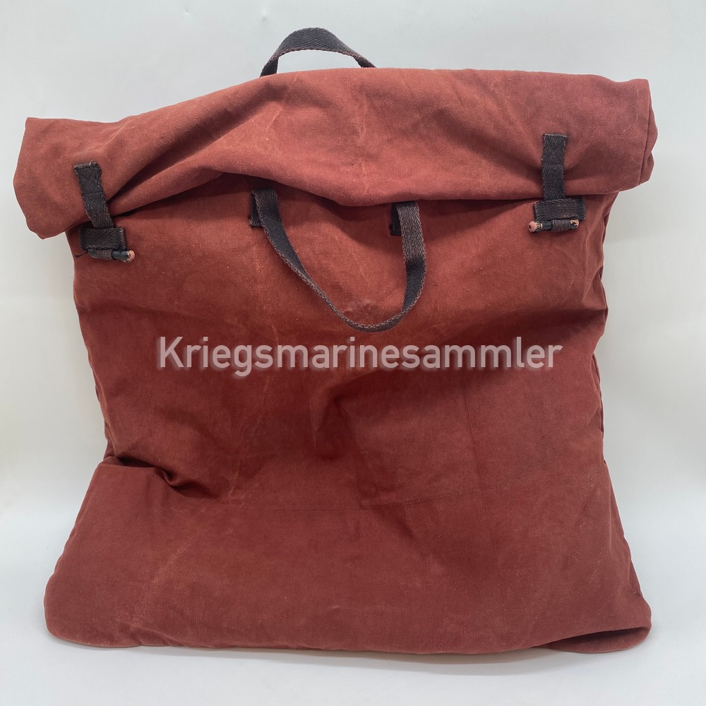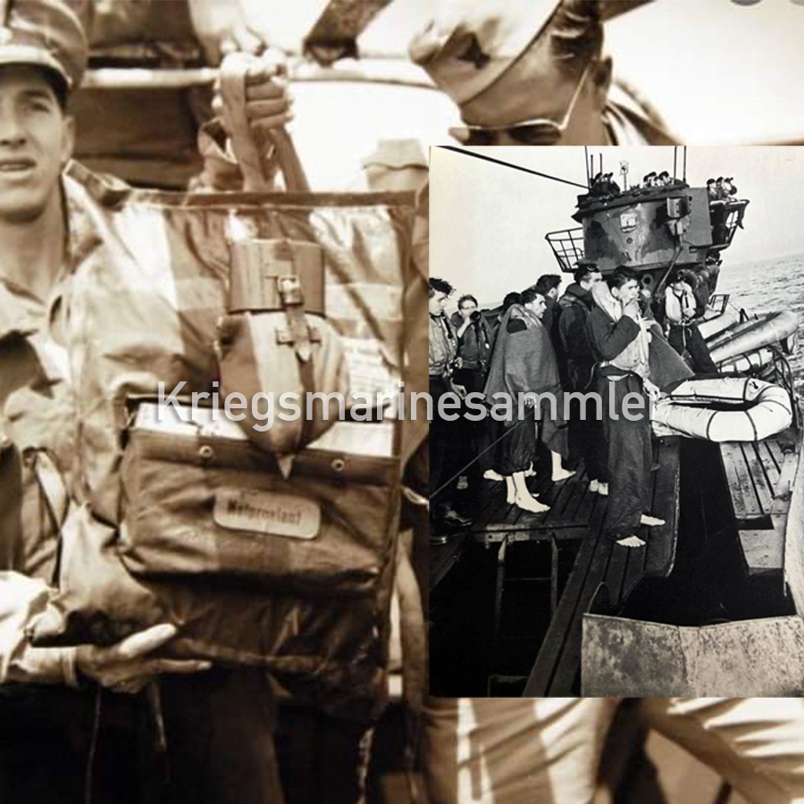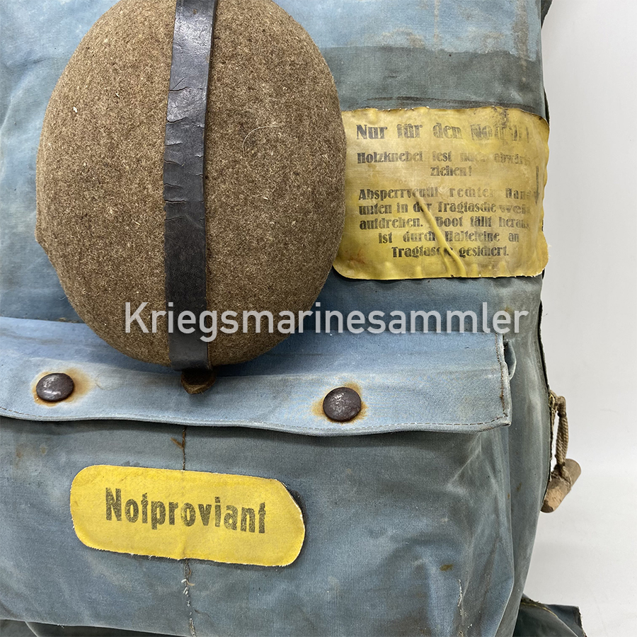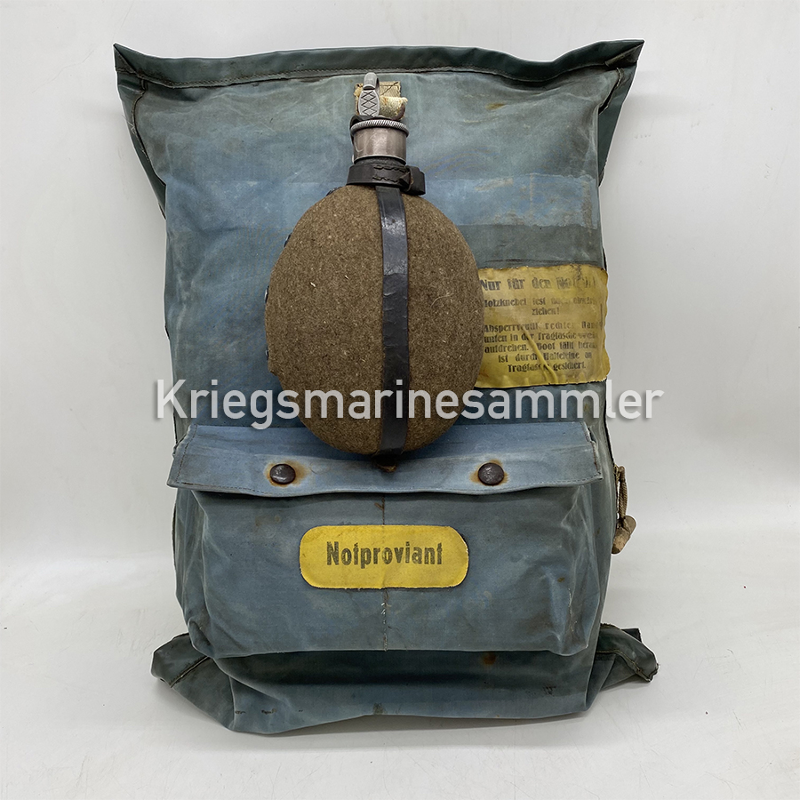 A rare Packhülle für Marine-Einmann-Schlauchboot (Bag for a One-man Life Raft). This bag/backpack was contained with a Einmann-Schlauchboot (One-man Life Raft), Notproviant (Emergency Food) and one Feldflasche (Canteen). This was a very important survival equipment. On many pictures these life rafts can be seen. The last picture shows US-Navy with a Packhülle found in the water after the sinking of a U-Boot.