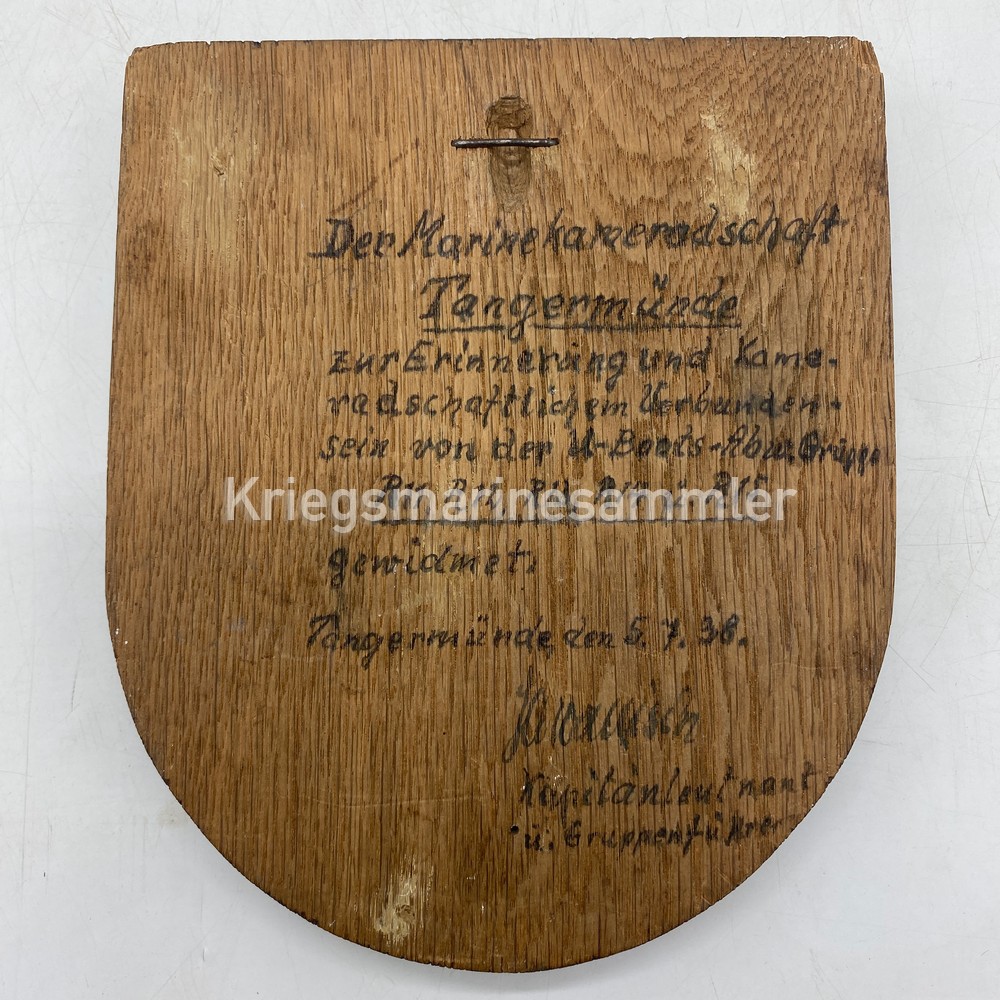 Unterseebootschule Wappen/Plaque which are not commonly seen. It’s made from wood and still remains his original paint which makes this plaque looks very colourfull. On the last picture owned by Berlin Militaria You can see the same plate used on a School U-Boot. It seems that this plate was gifted from the Marinekameradschaft in Tangermünde for his remembrance and good association with the U-Boot-Abw. Gruppe R11, R12, R13, R14 and R15 at 5 July 1938 to Kapitänltnt and Gruppenführer …(Name sadly not readable for me”….nisch”?). If anyone is able to identify more about this name, I would really appreciate it, I’ve tried to make researches among Raumboten Flotilles but nothing succesfull. Kriegsmarinesammler@hotmail.com