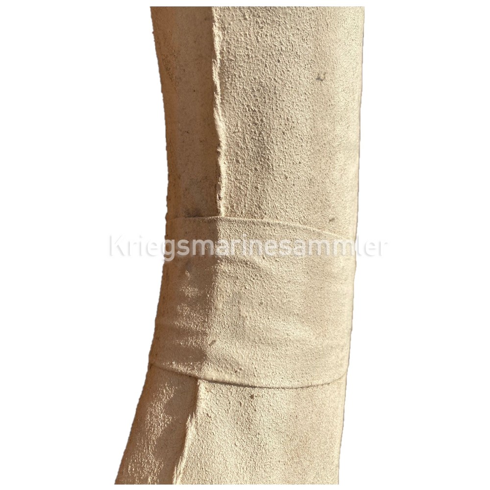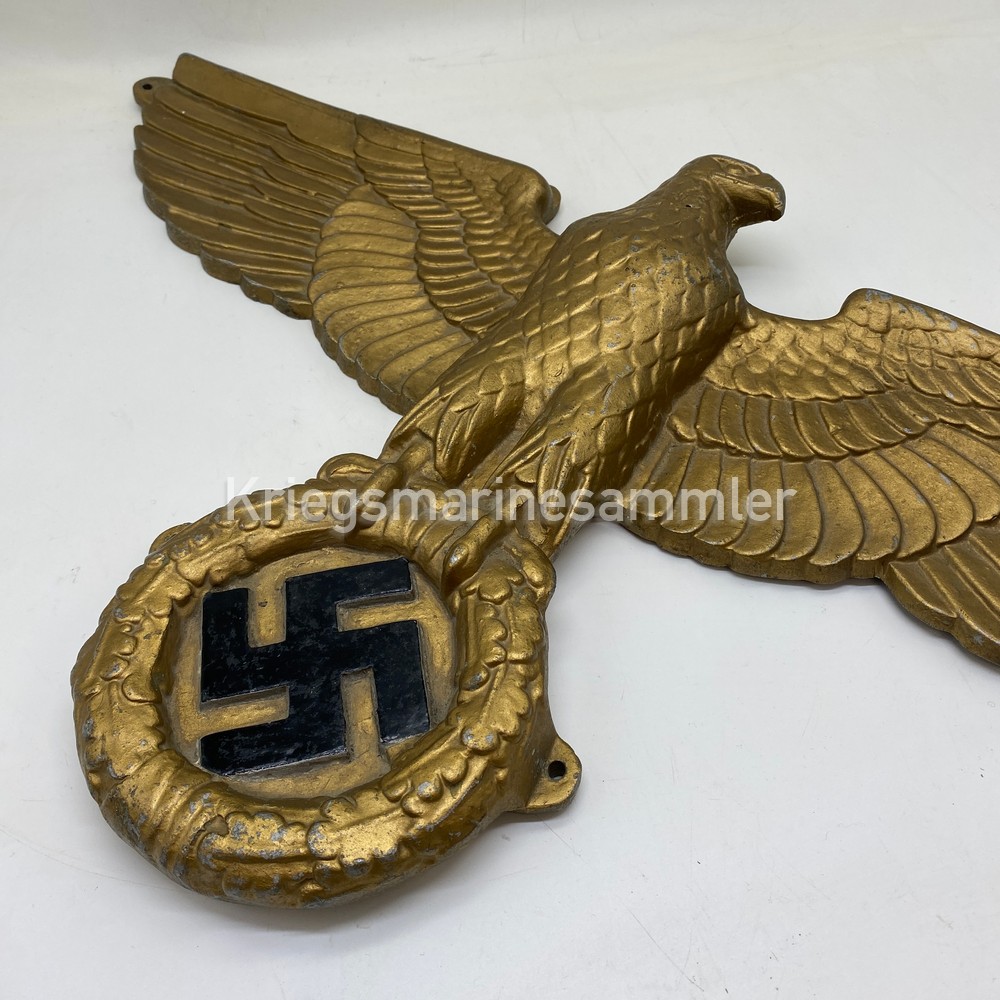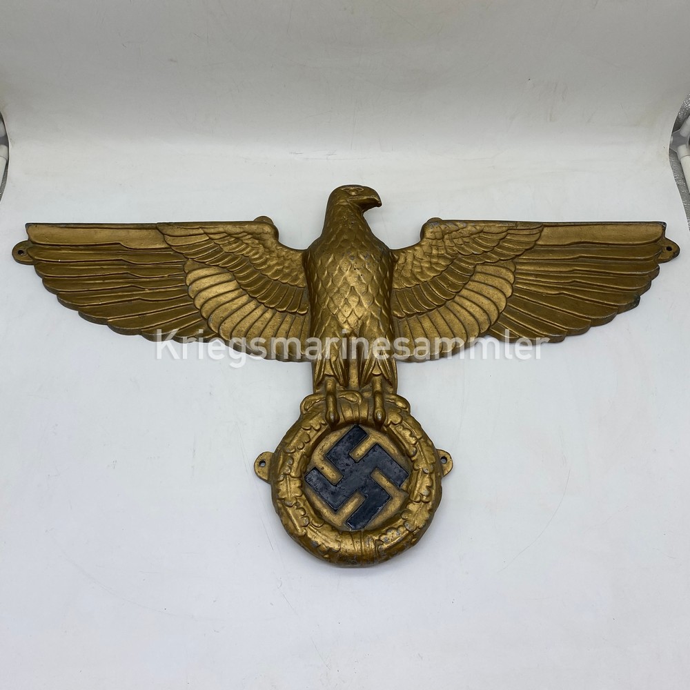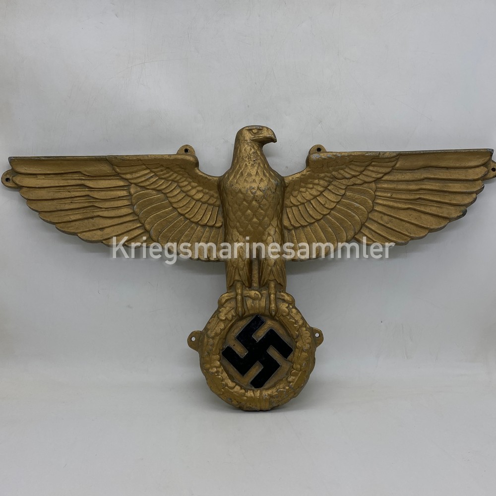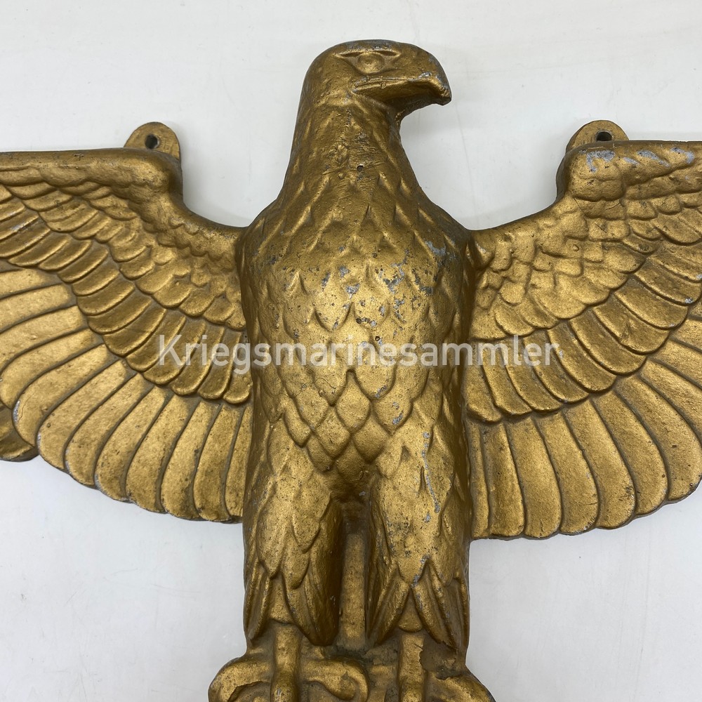 An extremely rare original Eagle, which was mounted in front of the Conning tower of a U-Boot. These eagles came in a couple variants. The front facing ones, and this model facing its side with its very distinguishable brackets to mount the eagle onto the conning tower. This particular eagle has been Painted into gold like paint, with the cross highlighted in black. Which can also be seen on some original pictures that these eagles were also painted by the crew. In 1940 the U-Boot crews where obligated to remove the Eagles from the conning tower, this means only early type U-Boots where equiped with this eagle. They came in Brass and in Alluminium, This one is Alluminium with a size of around 74x40cm. More information can be found on the following website, in Catagory, Side facing Eagle.