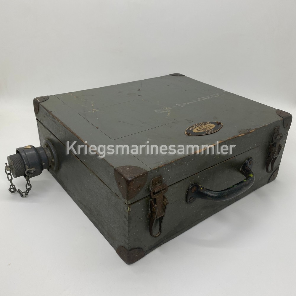 A very rare Taucher/Diver telephone set. Could have been used on U-Boots but also any other diving operation. The set is fully complete with 2 original battery’s and its telephone marked 1944 with its fully length cable which can be used outside the box when closed. It has a typical watertight Marine connector on the side, this connection would go to the diver. Produced by Hagenuk Kiel.