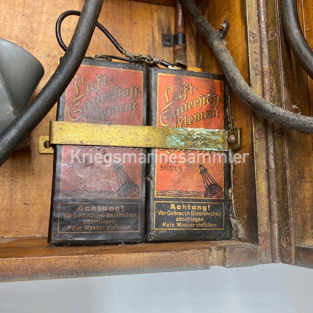 Alkali-Patronen where very important in a U-Boot, more then 200 of these were scattered all around the U-Boot in Baskets. They would supply fresh air to the crew on board when the air supply couldnt be running due to certain reasons. For example when submerged and they had to be very quiet for stealth efficiency. These cans can be refilled like shown in U995 here. These Alkali-Patronen would be used with an added Breathing mask. They are made by ‘byd’ (=Dräger) and nicely marked with DRP.