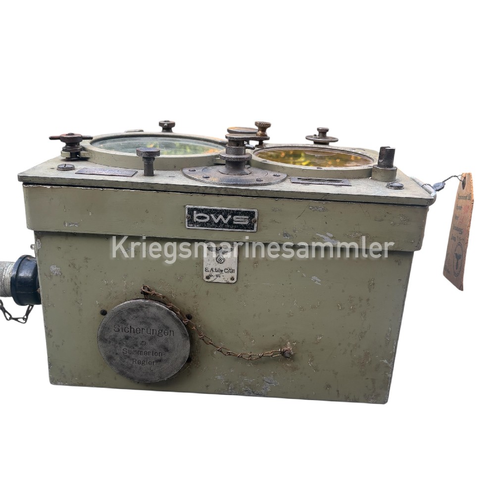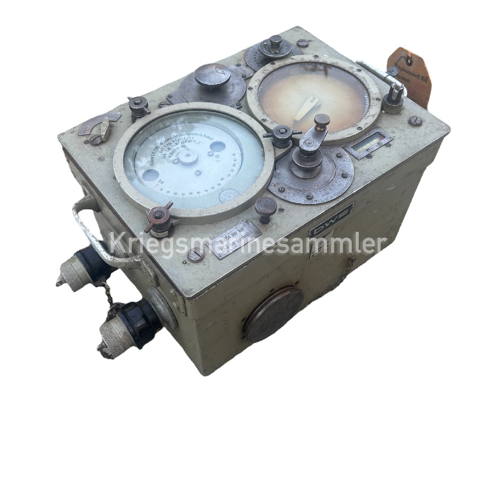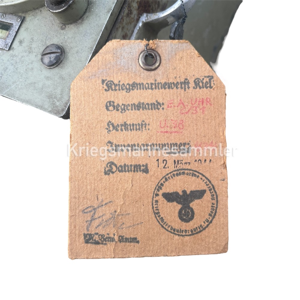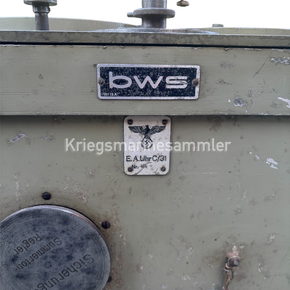 Extremely Rare Device Called E. A. Uhr C/31 (Entfernungsmesser Mess- und Aufschlaguhr). The Calculating device is made by ‘bws’, and was used to calculate trajectories for the Naval gun 10,5cm S.K.C/32 by using multiple handles and discs the Device gives you the correct data to fire the Gun at the target. Very intresting is that the item is labeled with and original stamped lead seal by Kriegsmarinewerft Kiel 12 March 1944 and was assigned for U-38, which could be correct since U-Boot 38 had a 10,5cm S.K.C/32.