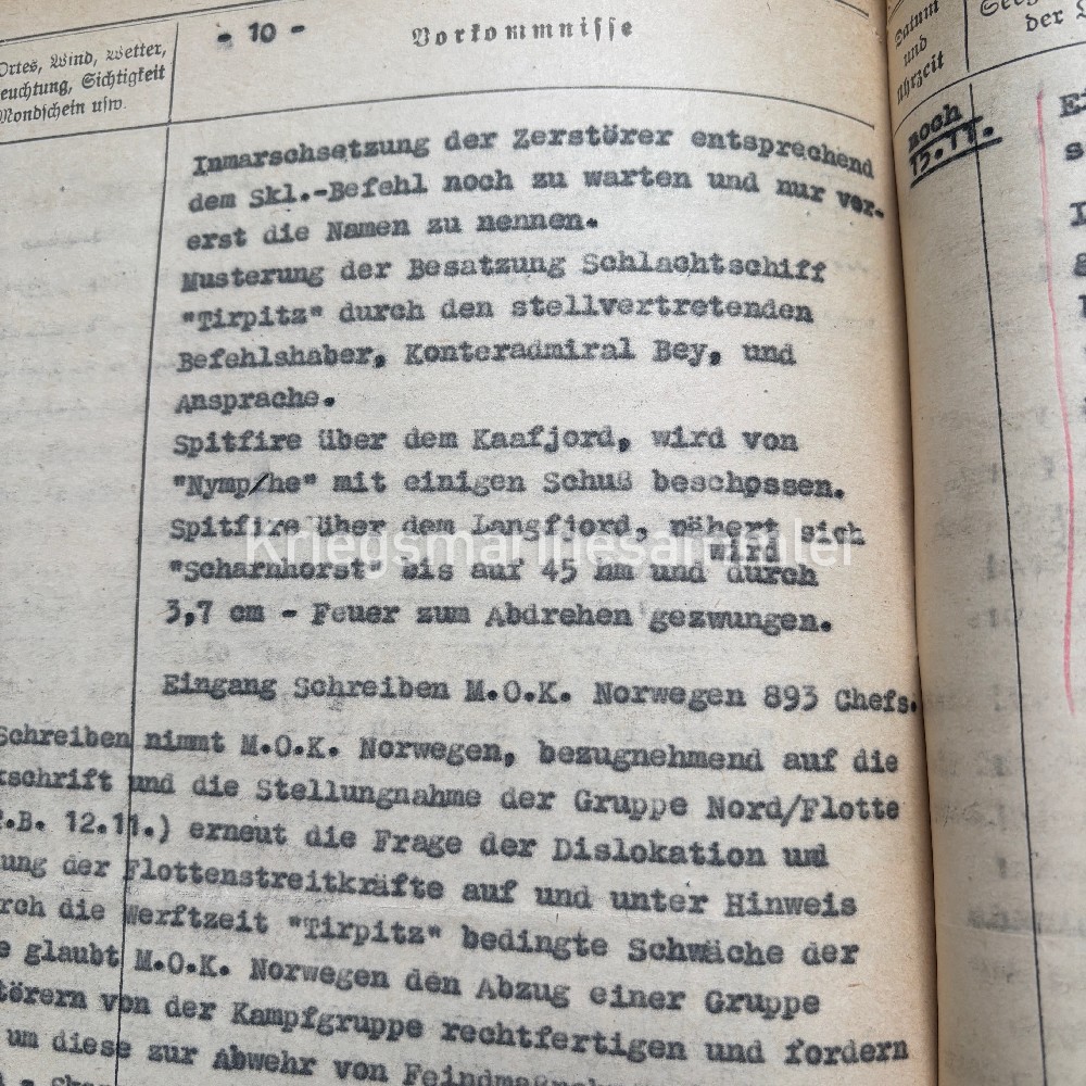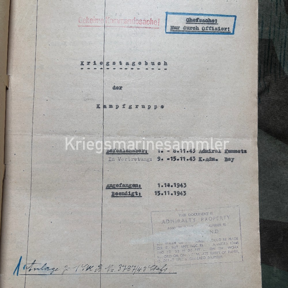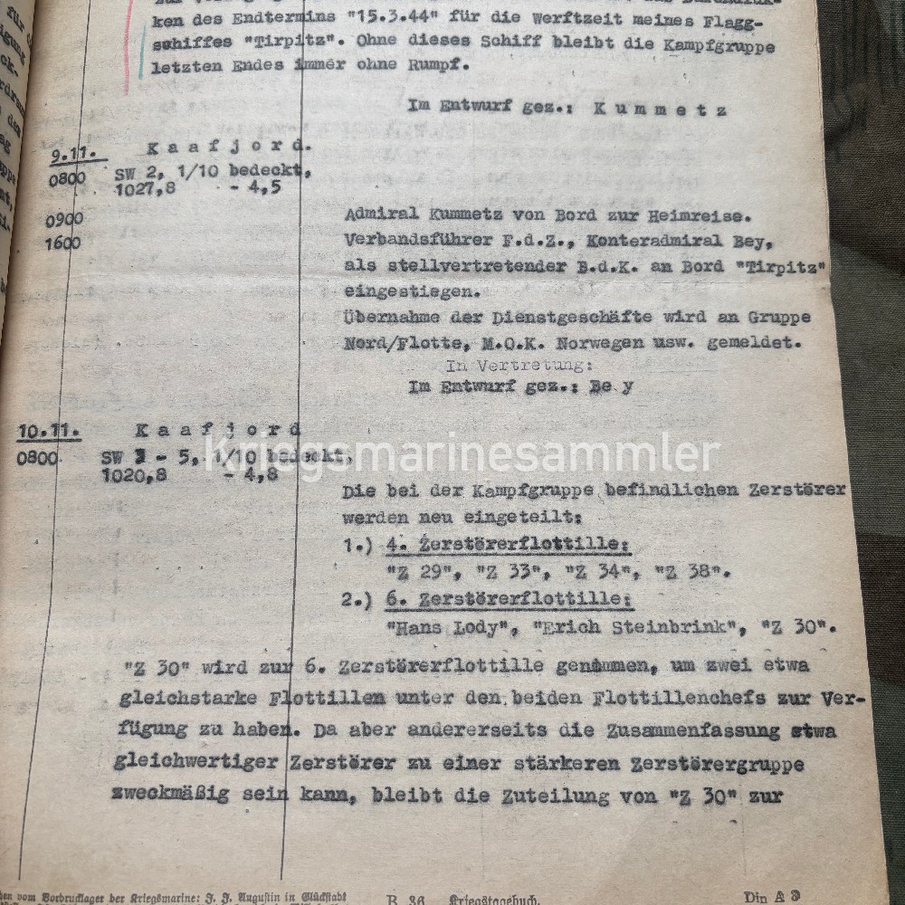 Rare Kriegstagebuch from Kampfgruppe, a Heavy Naval unit containing many Destroyer. Starting up in Febr 43 till Okt 44. The KTB contains its the full logs of 1 November till 15 November under the command of Admiral Oskar Kummetz & Konteradmiral Erich Bey. Leading the 4th & 6th Zerstörerflotille Z29 Z33 Z34 Z38, Hans Lody Erich Steinbrink Z30 and the Scharnhorst Inside the KTB allot is written, about the Repairs of the Tirpitz who was attacked by an English U-Boot, an attack of 2 Spitfires, Their Destroyers which were standby waiting for the repair of the Tirpitz and much more, I also suggest reading the Wikipage about the Kampfgruppe. KAdm Bey died on the Scharnhorst on 26th December.