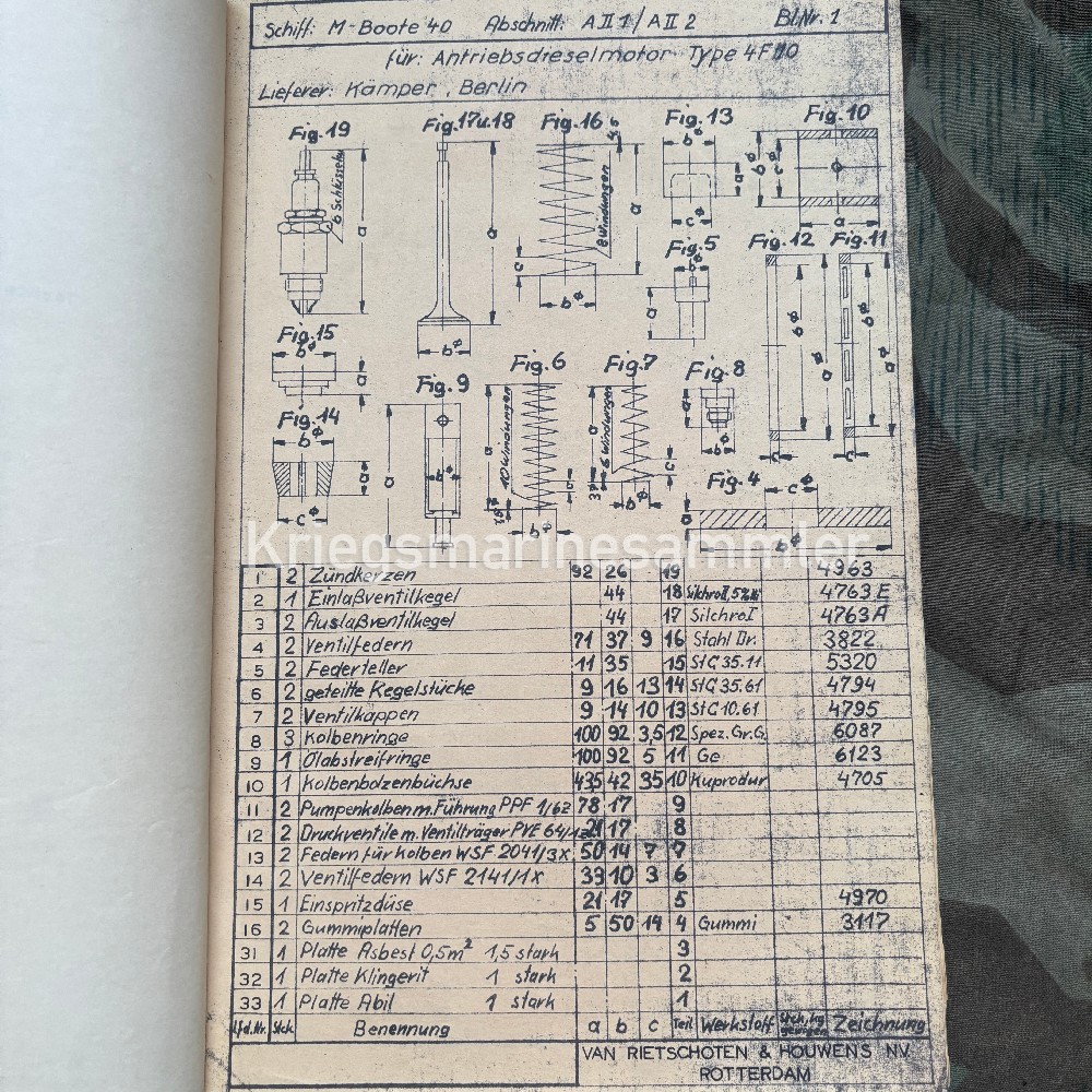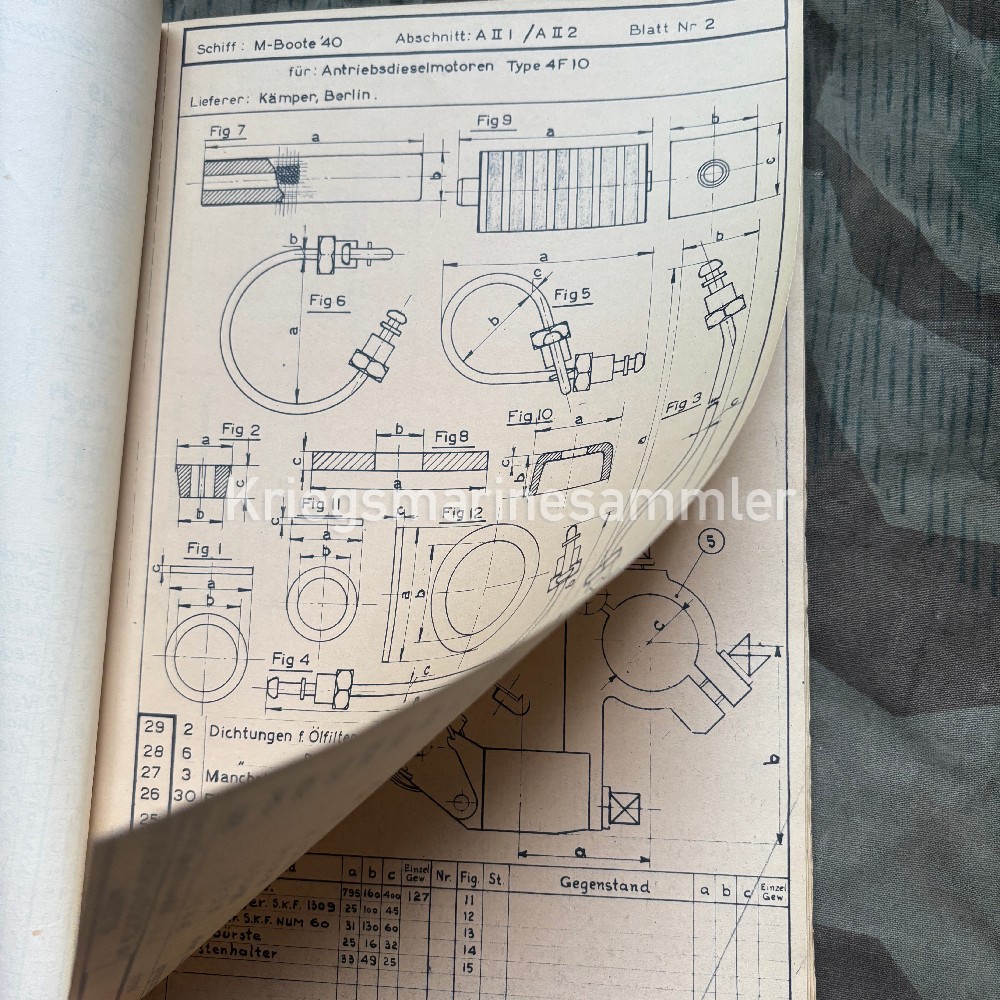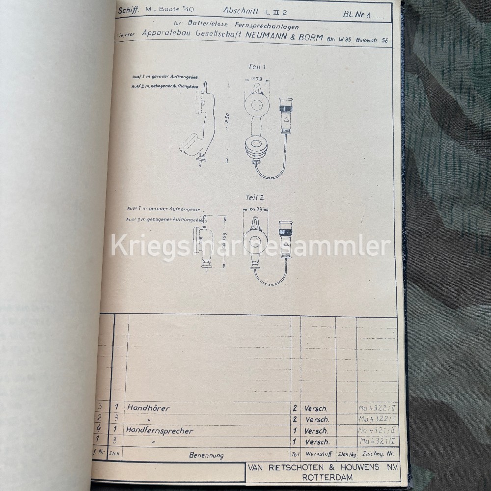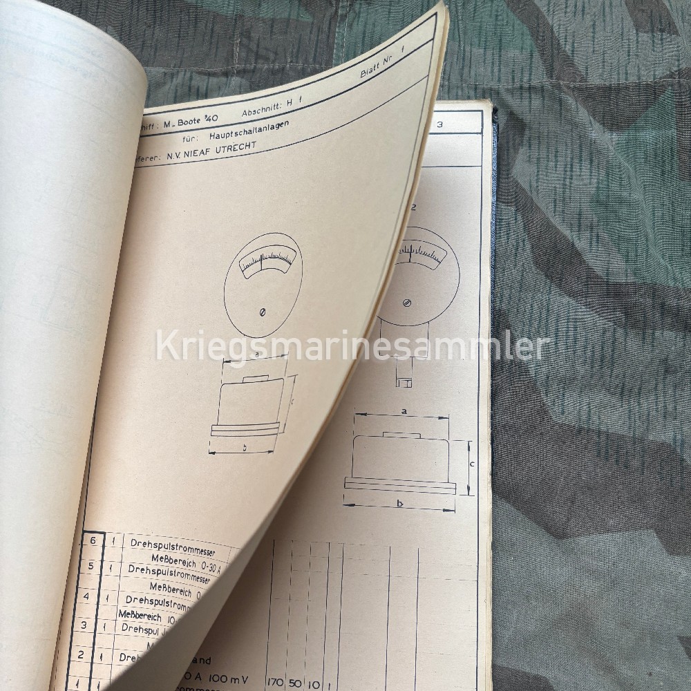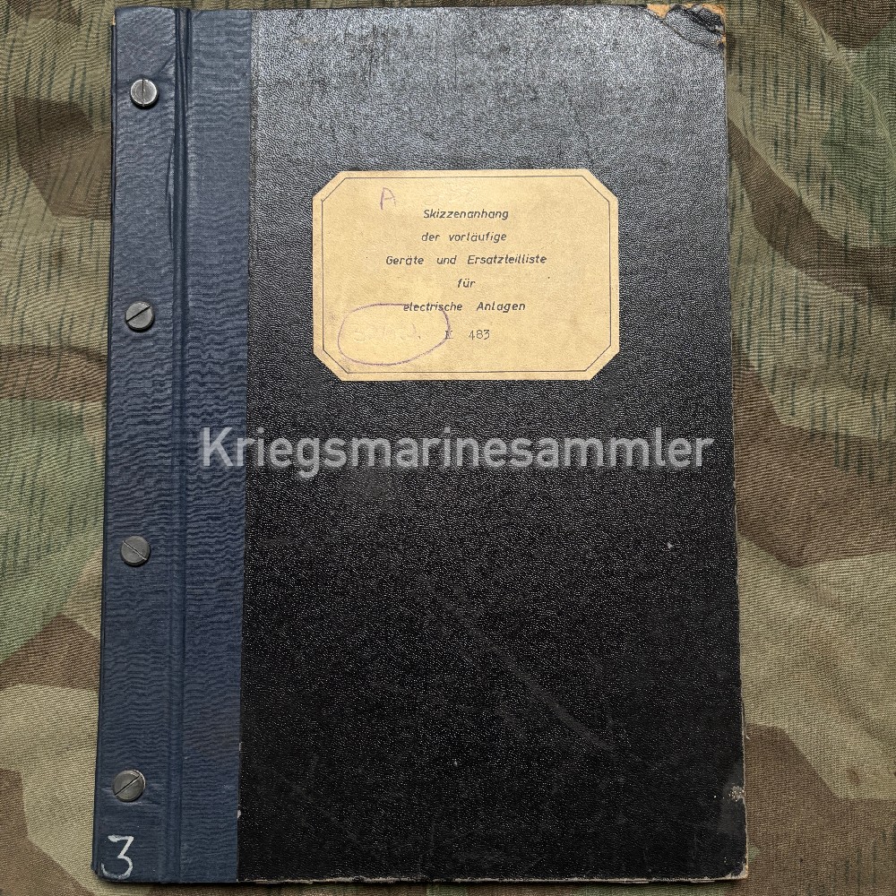 Skizzenanhang book for Minensuchboot 483, Containing a full list of devices and spare parts list for the Electric system. Thick book with many pages showing the voltmeters, screws, lamps, Spare Telephone parts, electric parts etc. The M483 was a type M40 Minesweeper build in Holland 1942 and was sunk in by an Aerial Bomb in 1943 near the Channel Islands